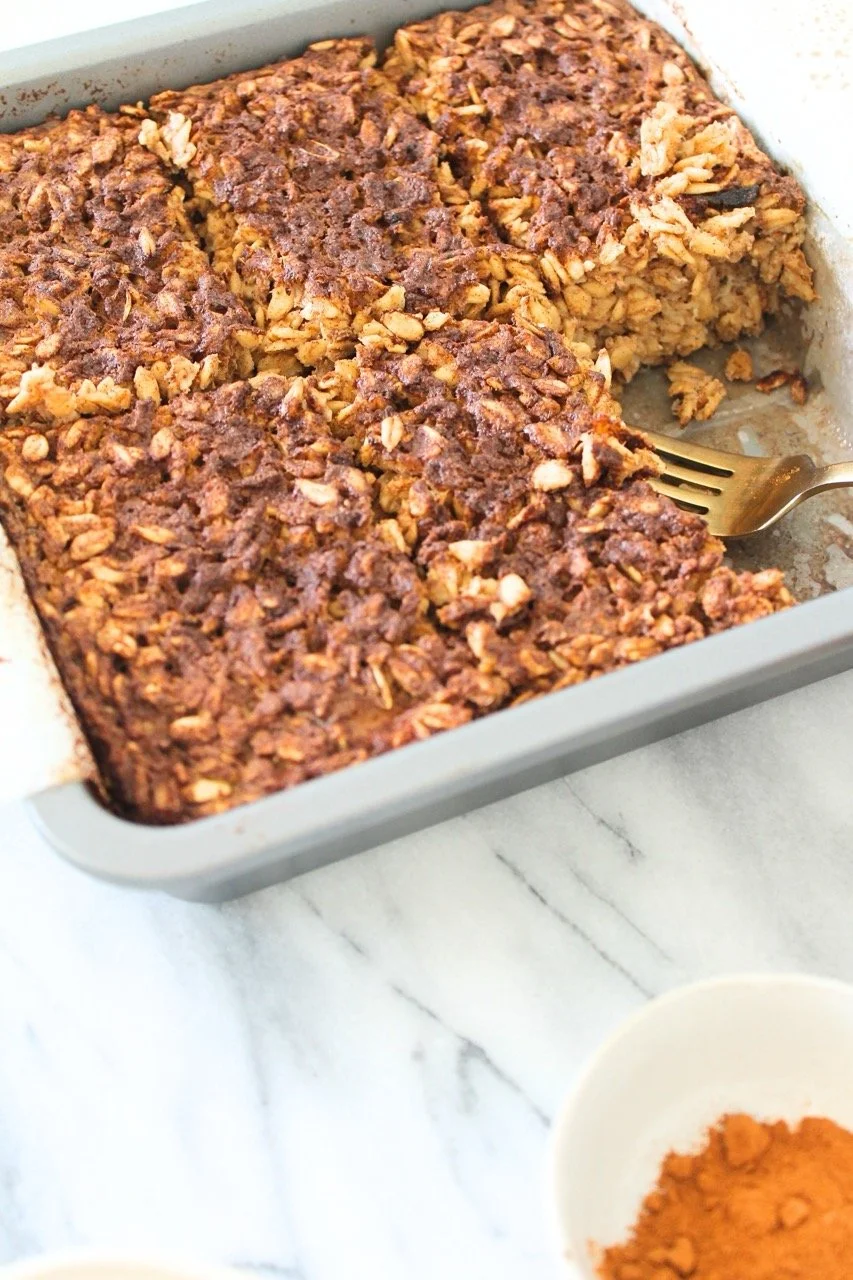 Line a 9x9 baking dish with parchment paper, and spray with a neutral cooking spray, coating all sides. Pour the oat mixture into the dish.
