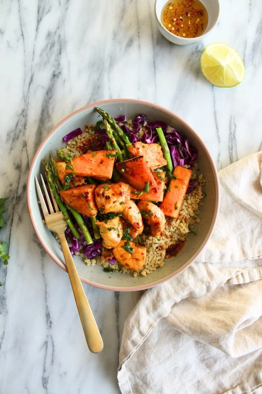 Hot honey is having its moment so why not let it shine with this hot honey chicken and quinoa bowl? Naturally gluten-free, dairy-free, high fiber and packed with protein for a healthy, satisfying dinner or lunch any day of the week!